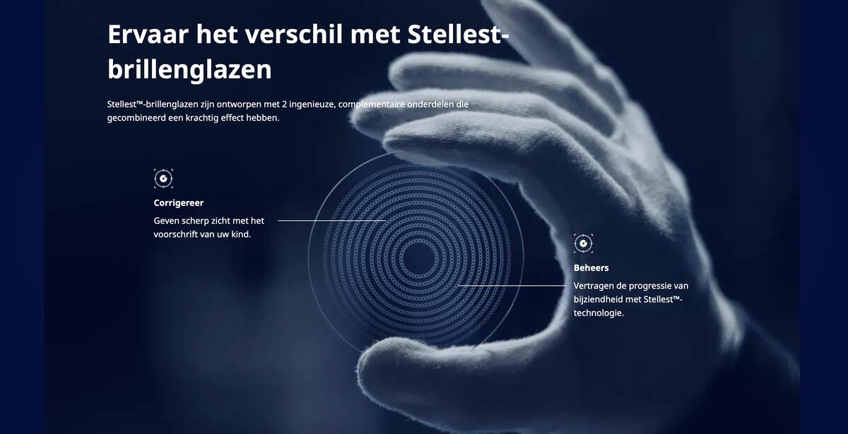 De Stellest™-glazen zijn de nieuwste innovatie van Essilor® om de vooruitgang van bijziendheid bij kinderen af te remmen. In vergelijking met standaardlenzen remmen de Stellestglazen de vooruitgang van bijziendheid gemiddeld met 67% af , wanneer ze 12 uur per dag gedragen worden.